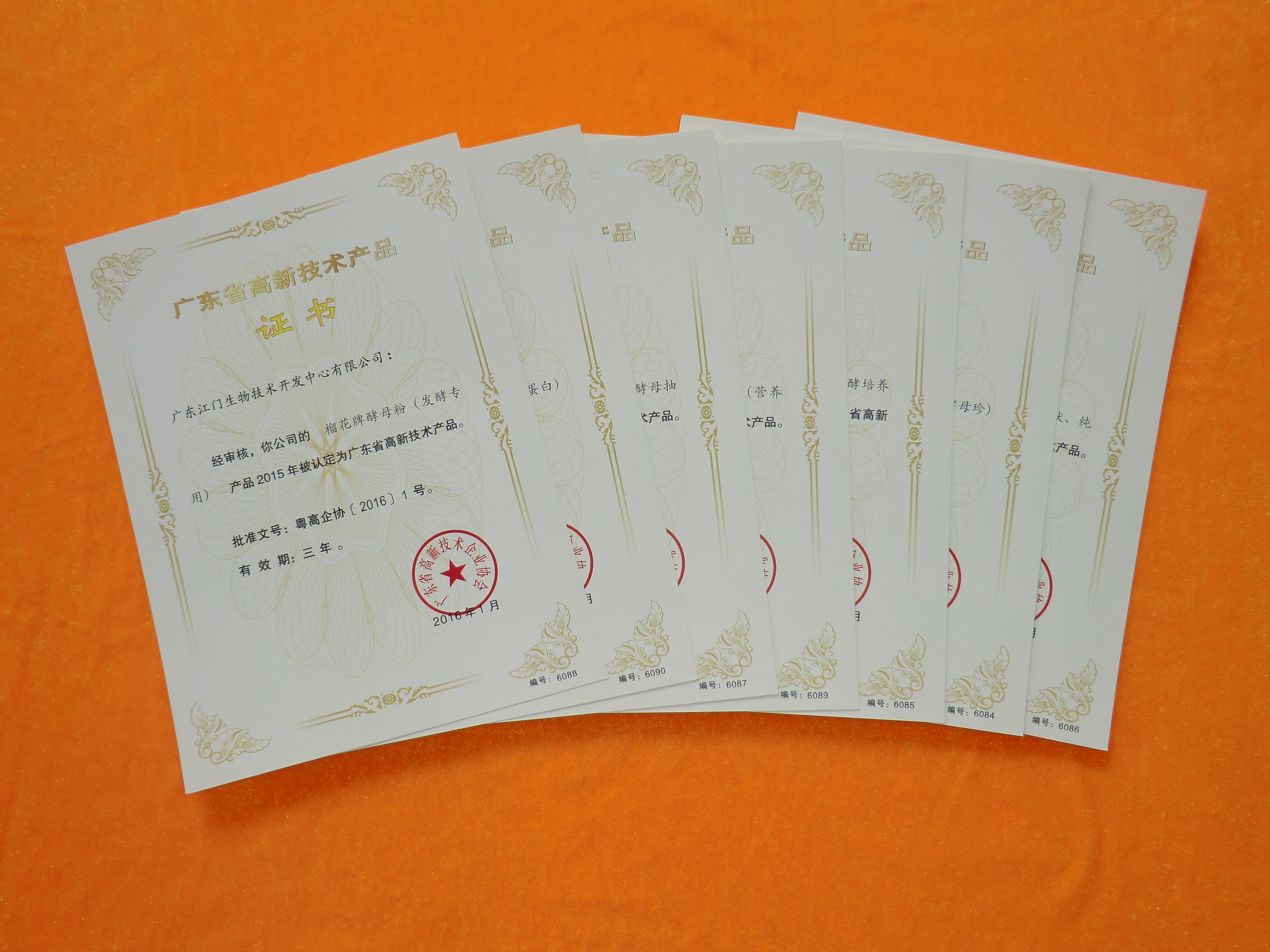 2016年1月份,生物中心的食用酵母、榴花牌酵母粉、酵母抽提物、酵母精粉、破壁型食用酵母、風味復(fù)合酵母、甘蔗糖蜜酵母發(fā)酵培養(yǎng)物共7項產(chǎn)品通過省科技廳嚴格審核,獲認定為2015年“廣東省高新技術(shù)產(chǎn)品”并取得證書。