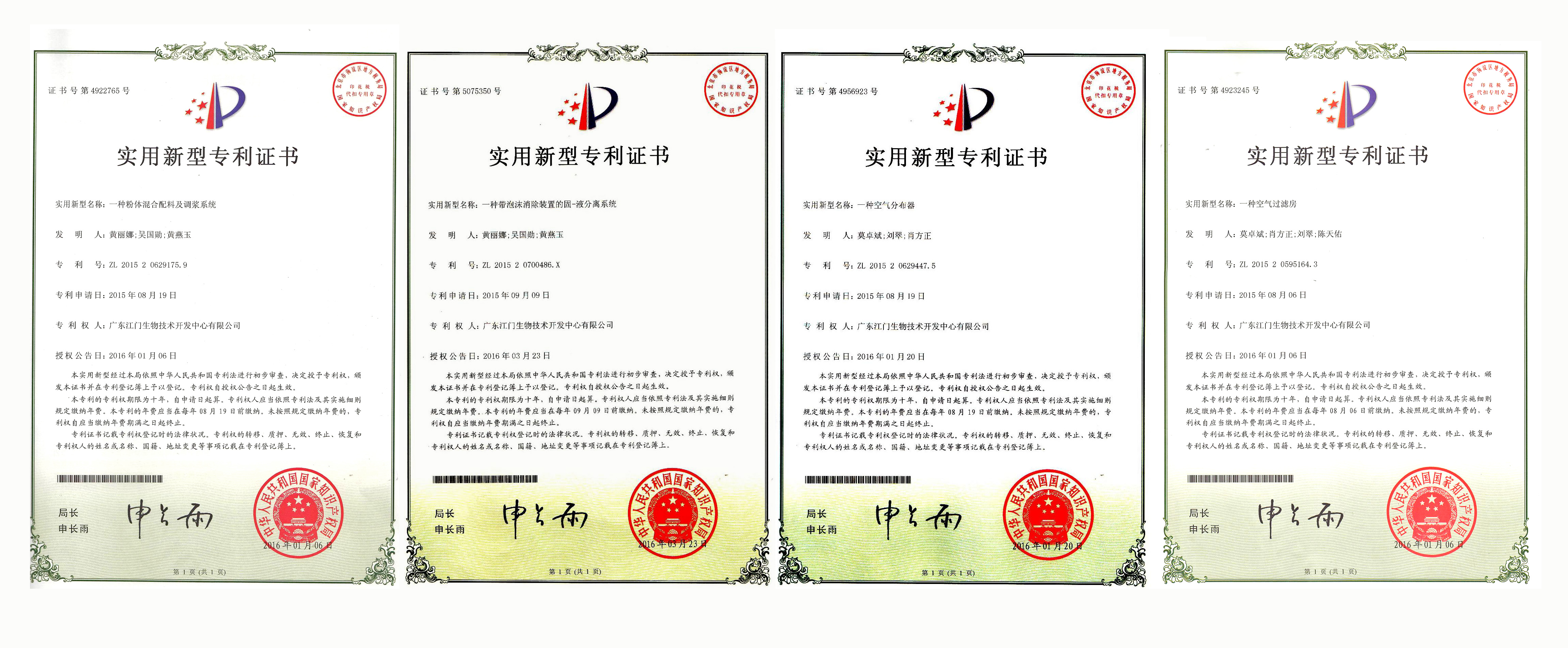 2016年4月底,生物中心知識產權保護收到成效,專利申報(授權)品種、數量同比實現歷史突破,《一種粉體混合配料及調漿系統》等4項關鍵設備取得實用新型專利授權。